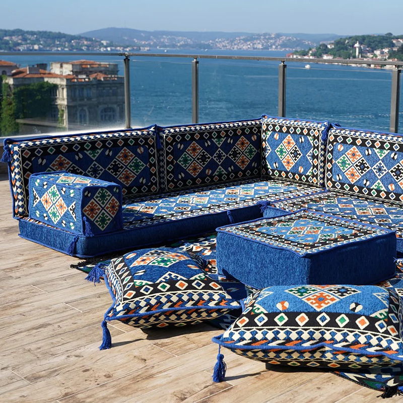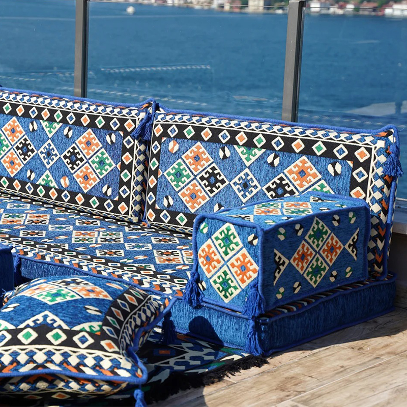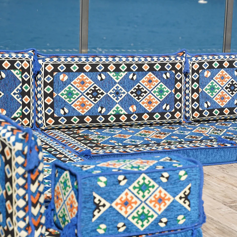 An Arabic floor sofa, also called a jalsa set, is a central element of traditional majlis furniture. This low-level seating arrangement is designed for comfort and communal living, encouraging conversation and connection in a relaxed, grounded setting. As the cornerstone of an Arabic majlis, these modular pieces, adorned with plush cushions, create a warm and inviting social space perfect for entertaining guests, family gatherings, and leisurely afternoons, beautifully blending timeless cultural tradition with everyday comfort.