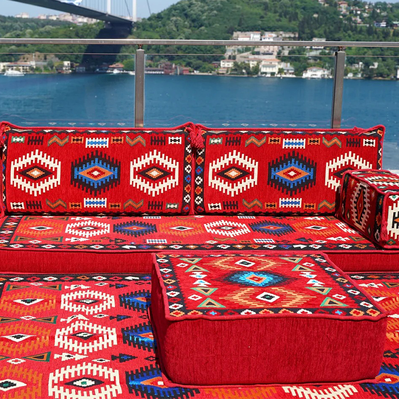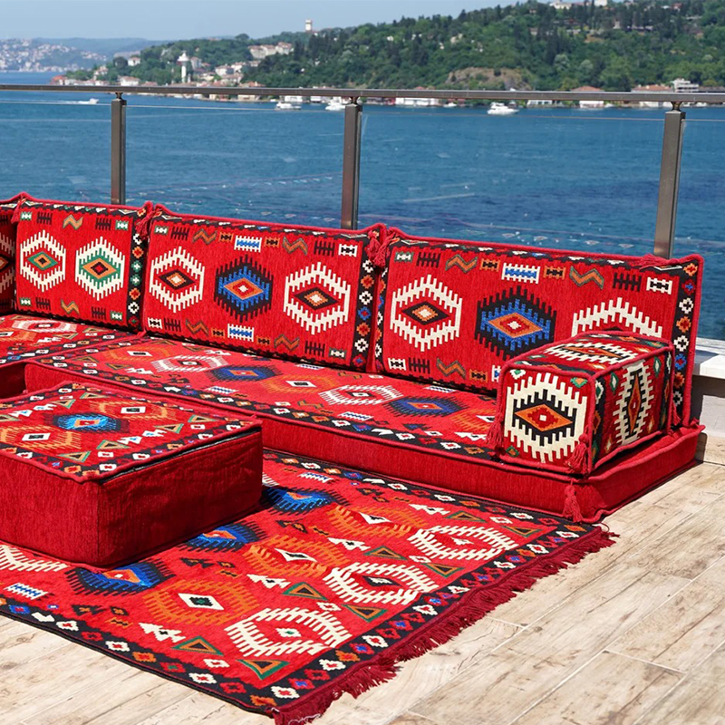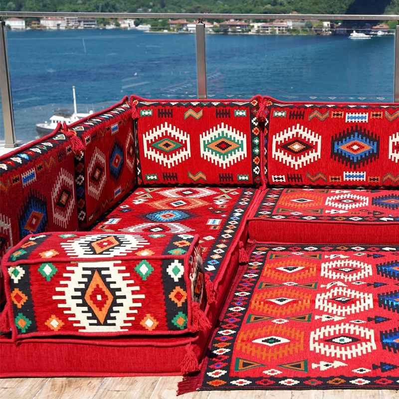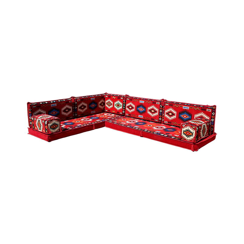 An Arabic floor sofa, also called a jalsa set, is a central element of traditional majlis furniture. This low-level seating arrangement is designed for comfort and communal living, encouraging conversation and connection in a relaxed, grounded setting. As the cornerstone of an Arabic majlis, these modular pieces, adorned with plush cushions, create a warm and inviting social space perfect for entertaining guests, family gatherings, and leisurely afternoons, beautifully blending timeless cultural tradition with everyday comfort.