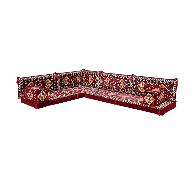An Arabic floor sofa, also called a jalsa set, is a central element of traditional majlis furniture. This low-level seating arrangement is designed for comfort and communal living, encouraging conversation and connection in a relaxed, grounded setting. As the cornerstone of an Arabic majlis, these modular pieces, adorned with plush cushions, create a warm and inviting social space perfect for entertaining guests, family gatherings, and leisurely afternoons, beautifully blending timeless cultural tradition with everyday comfort.