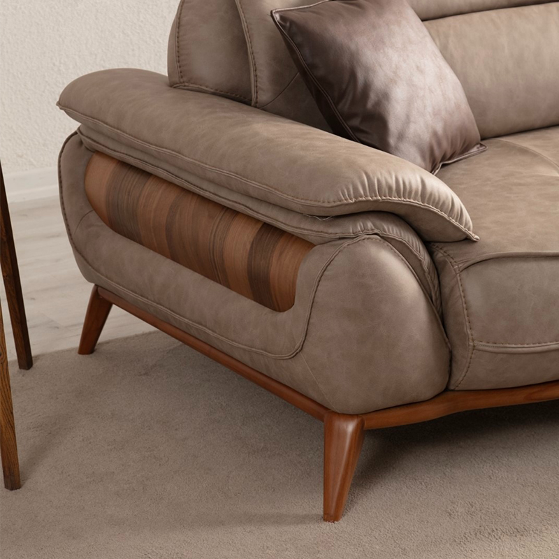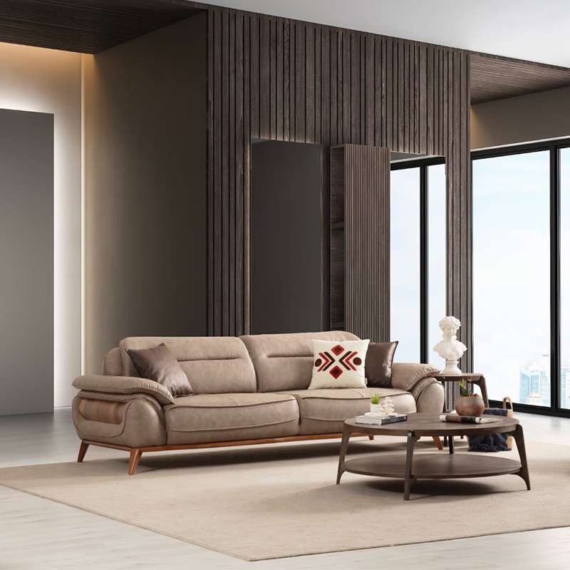 Upgrade your living room with a modern design lounge suite fits for the transitioning home. This sofa set is a gorgeous choice that offered in different color options. Curved arms design with strong solid wood base gives it comfortable seating experience.