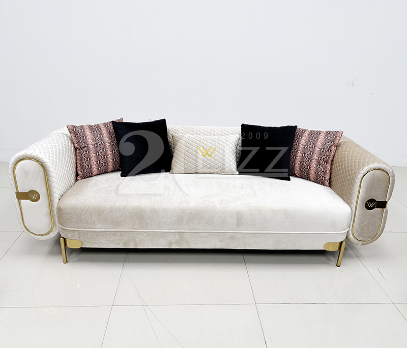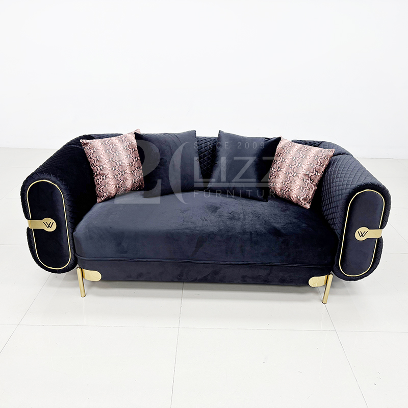 Turkish fabric sofa loveseat and chair, crafted with first-grade velvet fabric, or suede fabric options, this sofa offers versatility to match any décor. The double-stitched polyurethane foam wrapped in down feather ensures durability and plush seating, while the light gold stainless steel base adds a touch of sophistication to your living space.