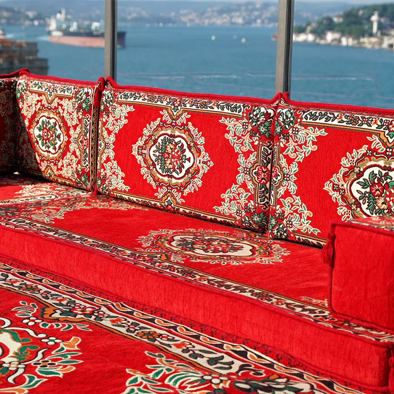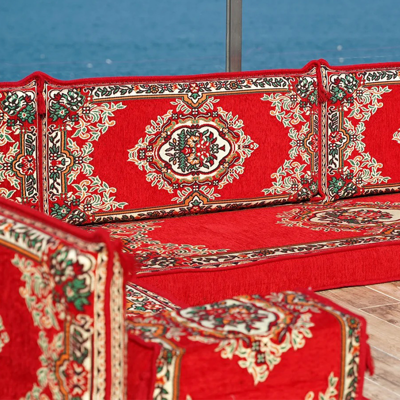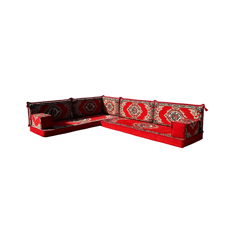 Desc.: Floral Floor Sofa Seating Set Arabic Floor Sofa Set Red Fabric Majlis