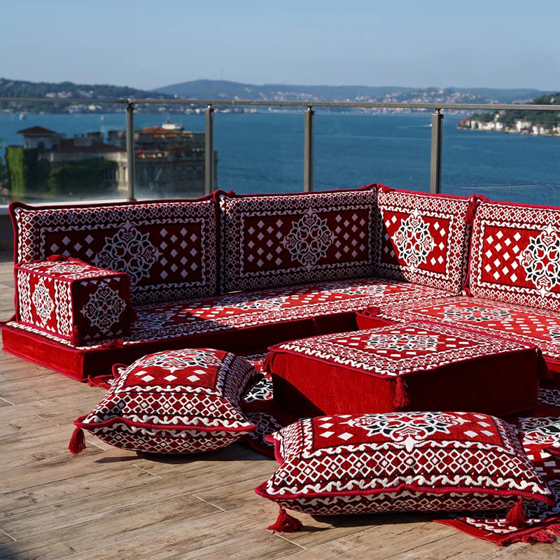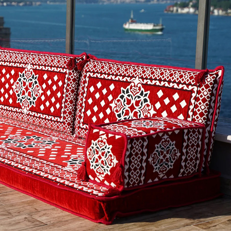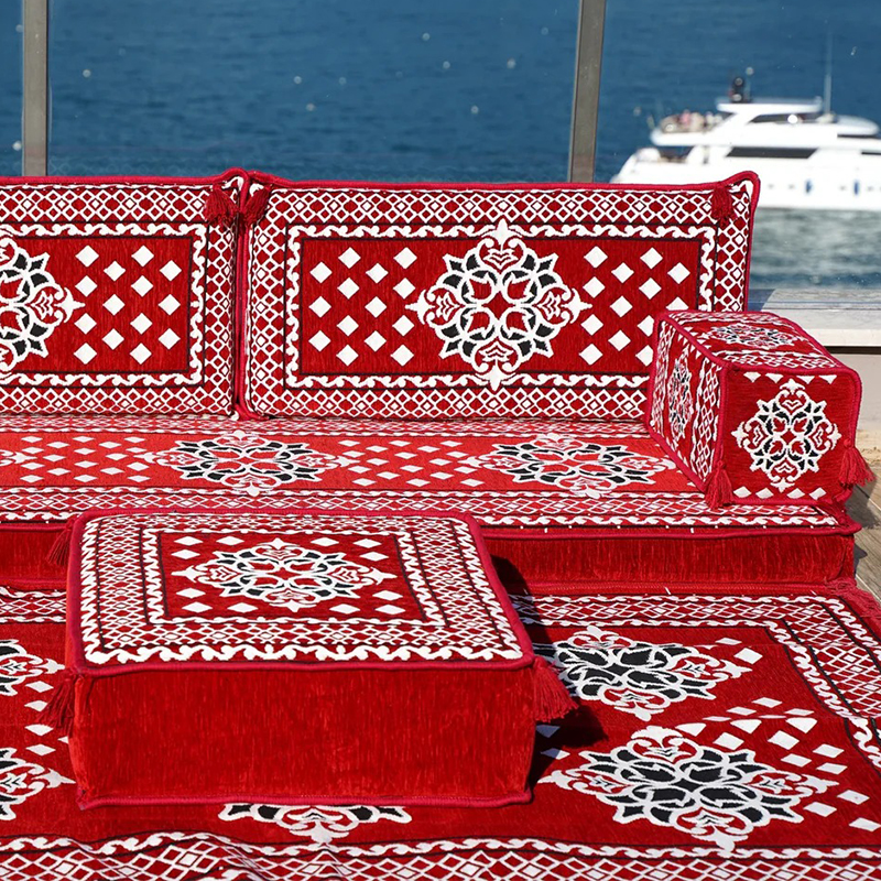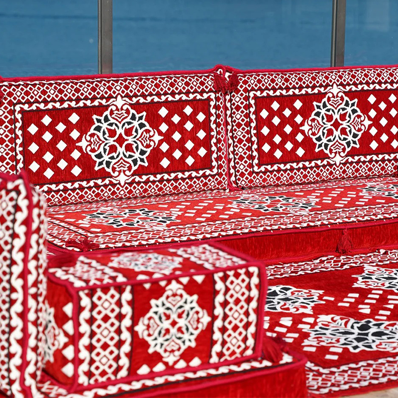 An Arabic floor sofa, also called a jalsa set, is a central element of traditional majlis furniture. This low-level seating arrangement is designed for comfort and communal living, encouraging conversation and connection in a relaxed, grounded setting. As the cornerstone of an Arabic majlis, these modular pieces, adorned with plush cushions, create a warm and inviting social space perfect for entertaining guests, family gatherings, and leisurely afternoons, beautifully blending timeless cultural tradition with everyday comfort.