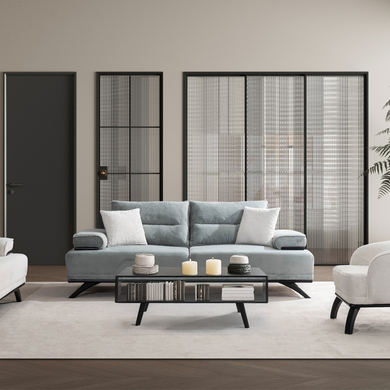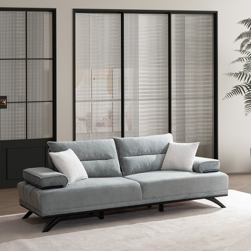 Turkish style furniture Diamond Sofa Set adds a sophisticated atmosphere to your living room with its modern and elegant design. It offers superior comfort with its soft cushions and quality fabric. This sofa set, which draws attention with its golden details and stylish lines, adapts to all kinds of decoration styles. This fabric couch set is an ideal choice for those looking for both comfort and elegance in your home.