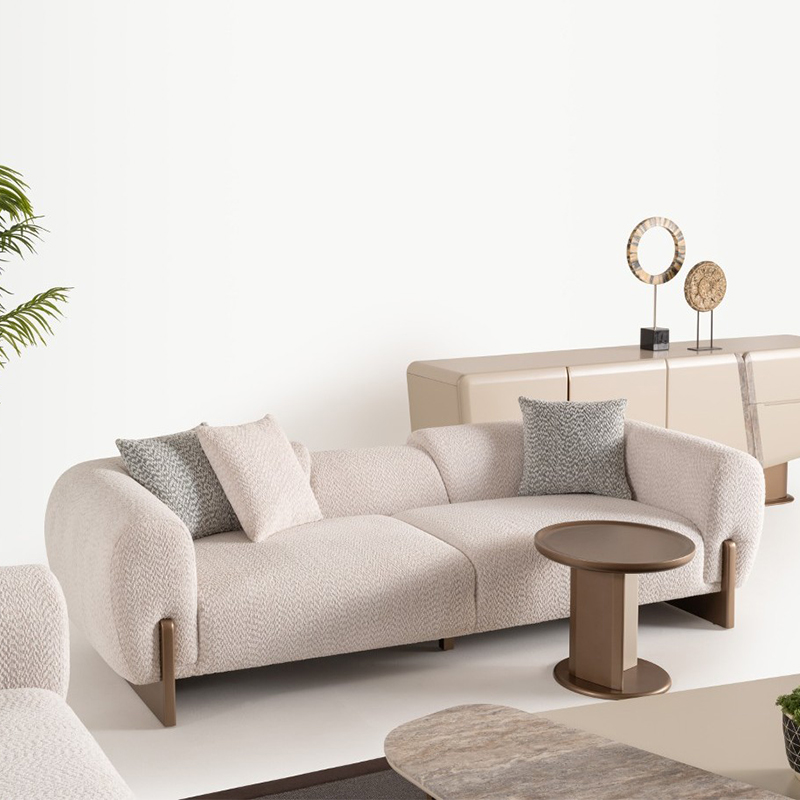 Turkish style furniture Linda Sofa Set adds a sophisticated atmosphere to your living room with its modern and elegant design. It offers superior comfort with its soft cushions and quality fabric. This sofa set, which draws attention with its golden details and stylish lines, adapts to all kinds of decoration styles. This fabric couch set is an ideal choice for those looking for both comfort and elegance in your home.