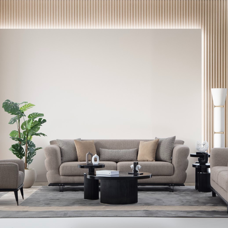 Upgrade your living room with a modern design lounge suite fits for the transitioning home. This sofa set is a gorgeous choice that offered in different color options. Curved arms design with strong solid wood base gives it comfortable seating experience.