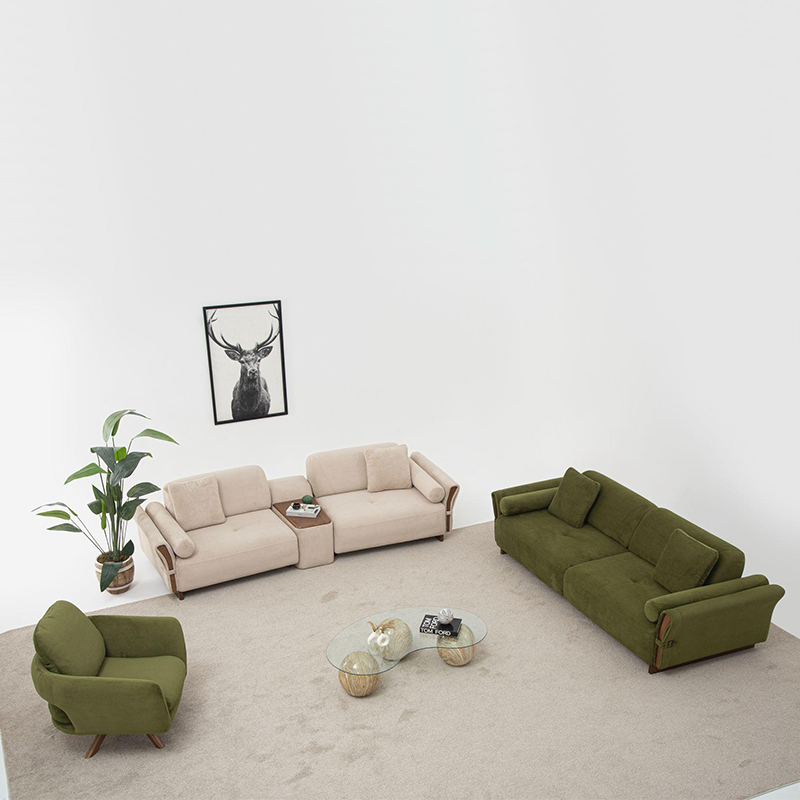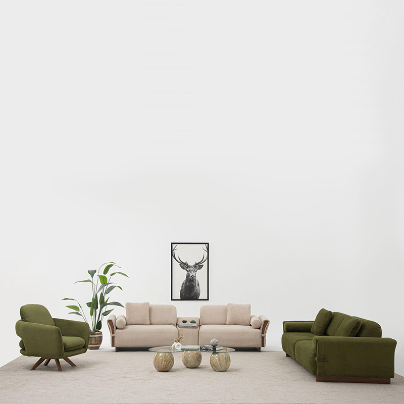 Turkish style furniture Mardimo Sofa Set adds a sophisticated atmosphere to your living room with its modern and elegant design. It offers superior comfort with its soft cushions and quality fabric. This sofa set, which draws attention with its golden details and stylish lines, adapts to all kinds of decoration styles. This fabric couch set is an ideal choice for those looking for both comfort and elegance in your home.