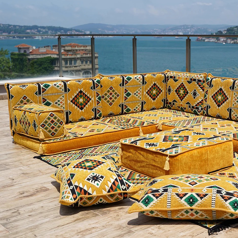 An Arabic floor sofa, also called a jalsa set, is a central element of traditional majlis furniture. This low-level seating arrangement is designed for comfort and communal living, encouraging conversation and connection in a relaxed, grounded setting. As the cornerstone of an Arabic majlis, these modular pieces, adorned with plush cushions, create a warm and inviting social space perfect for entertaining guests, family gatherings, and leisurely afternoons, beautifully blending timeless cultural tradition with everyday comfort.