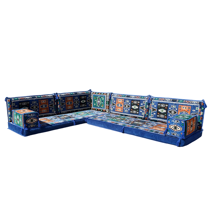 Desc.: Mix And Match Blue Fabric Arabic Floor Sofa Bench Cushions L Shape Corner Seating Set