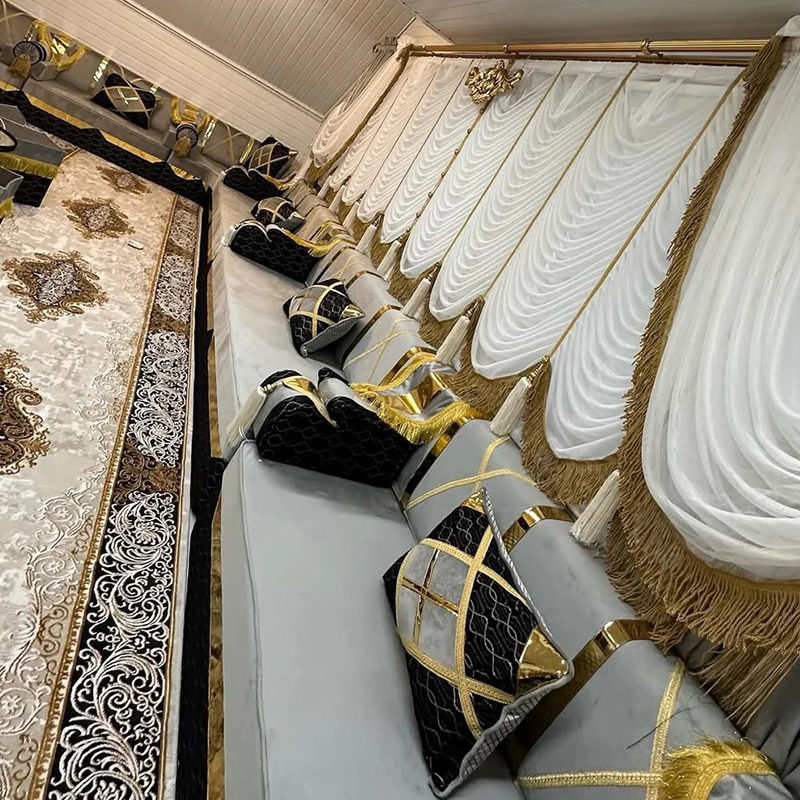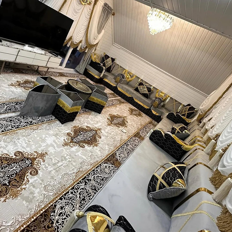 An Arabic floor sofa, also called a jalsa set, is a central element of traditional majlis furniture. This low-level seating arrangement is designed for comfort and communal living, encouraging conversation and connection in a relaxed, grounded setting. As the cornerstone of an Arabic majlis, these modular pieces, adorned with plush cushions, create a warm and inviting social space perfect for entertaining guests, family gatherings, and leisurely afternoons, beautifully blending timeless cultural tradition with everyday comfort.