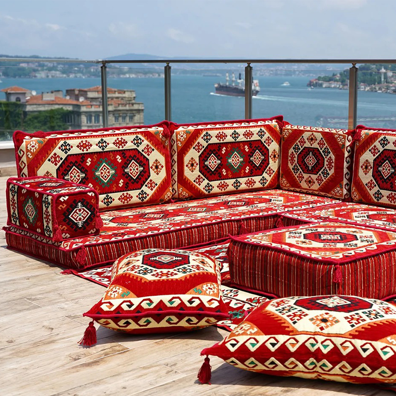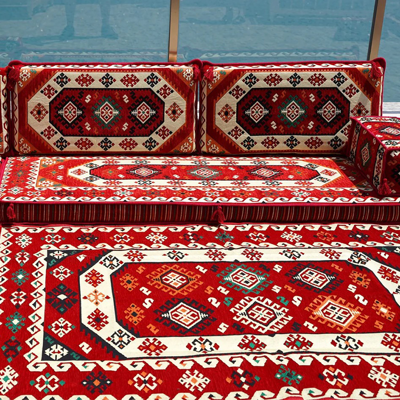 An Arabic floor sofa, also called a jalsa set, is a central element of traditional majlis furniture. This low-level seating arrangement is designed for comfort and communal living, encouraging conversation and connection in a relaxed, grounded setting. As the cornerstone of an Arabic majlis, these modular pieces, adorned with plush cushions, create a warm and inviting social space perfect for entertaining guests, family gatherings, and leisurely afternoons, beautifully blending timeless cultural tradition with everyday comfort.