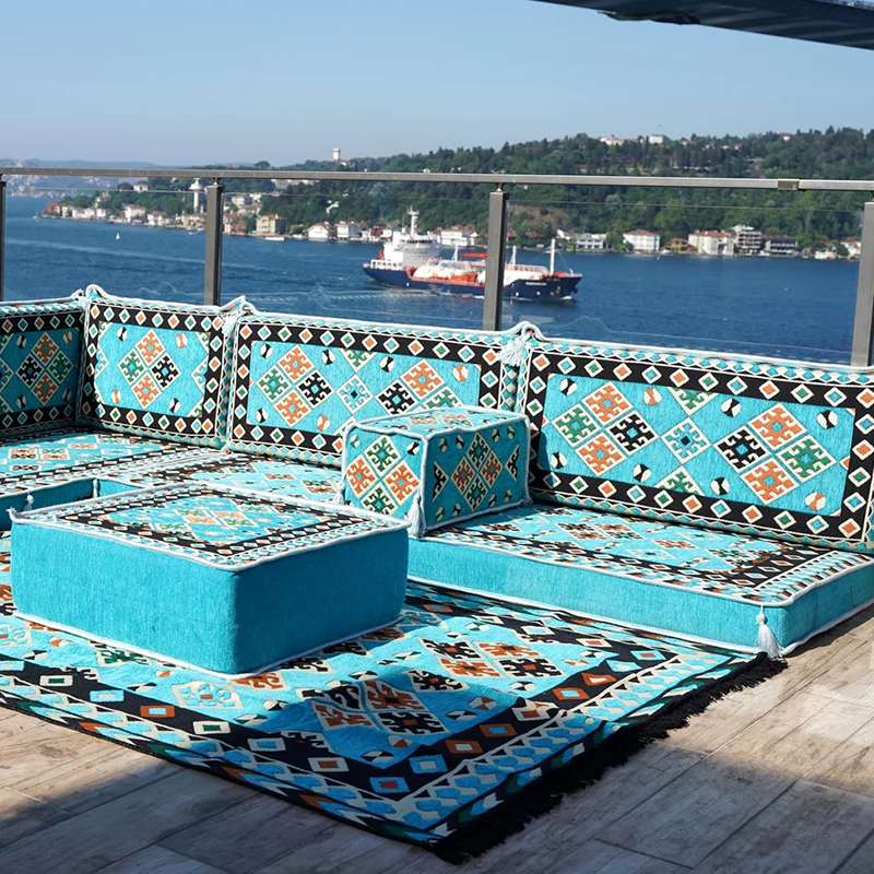 An Arabic floor sofa, also called a jalsa set, is a central element of traditional majlis furniture. This low-level seating arrangement is designed for comfort and communal living, encouraging conversation and connection in a relaxed, grounded setting. As the cornerstone of an Arabic majlis, these modular pieces, adorned with plush cushions, create a warm and inviting social space perfect for entertaining guests, family gatherings, and leisurely afternoons, beautifully blending timeless cultural tradition with everyday comfort.