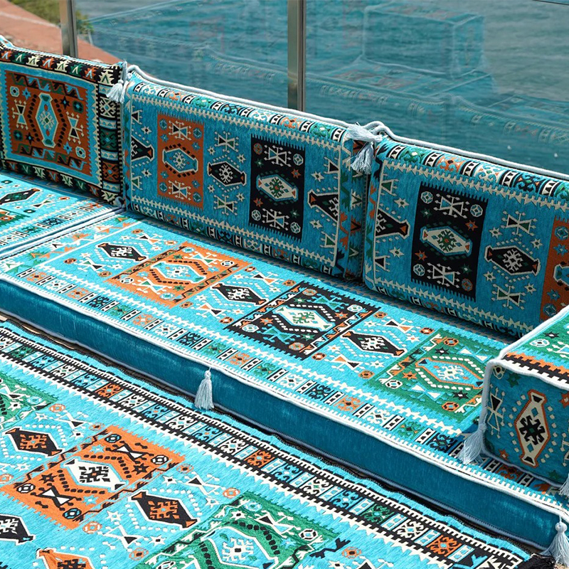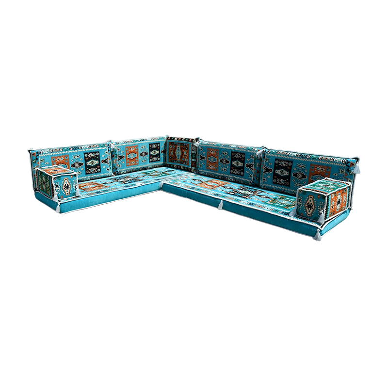 An Arabic floor sofa, also called a jalsa set, is a central element of traditional majlis furniture. This low-level seating arrangement is designed for comfort and communal living, encouraging conversation and connection in a relaxed, grounded setting. As the cornerstone of an Arabic majlis, these modular pieces, adorned with plush cushions, create a warm and inviting social space perfect for entertaining guests, family gatherings, and leisurely afternoons, beautifully blending timeless cultural tradition with everyday comfort.