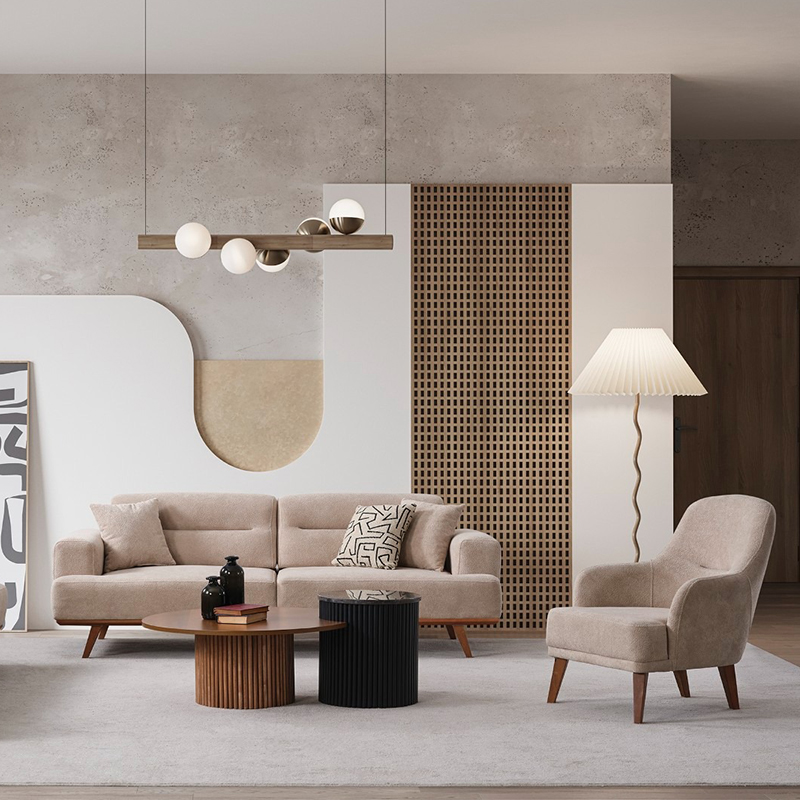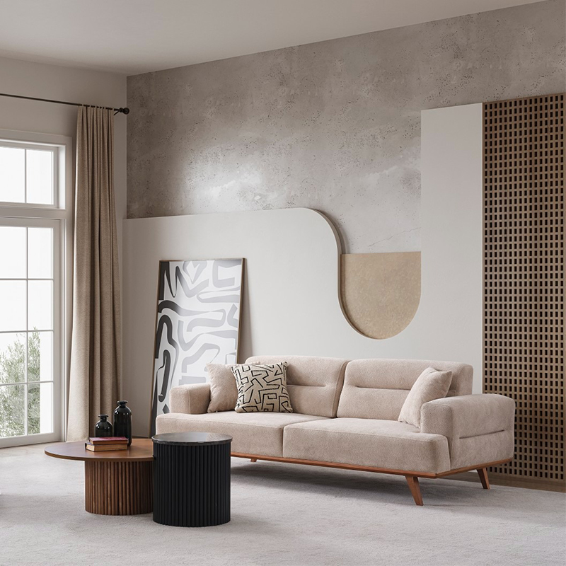 Turkish style furniture Livas Sofa Set adds a sophisticated atmosphere to your living room with its modern and elegant design. It offers superior comfort with its soft cushions and quality fabric. This sofa set, which draws attention with its golden details and stylish lines, adapts to all kinds of decoration styles. This fabric couch set is an ideal choice for those looking for both comfort and elegance in your home.