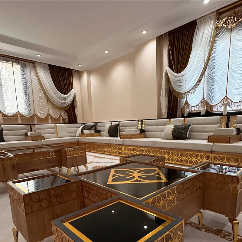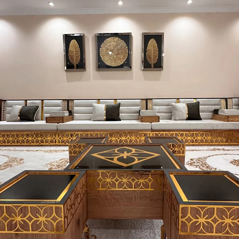 An Arabic floor sofa, also called a jalsa set, is a central element of traditional majlis furniture. This low-level seating arrangement is designed for comfort and communal living, encouraging conversation and connection in a relaxed, grounded setting. As the cornerstone of an Arabic majlis, these modular pieces, adorned with plush cushions, create a warm and inviting social space perfect for entertaining guests, family gatherings, and leisurely afternoons, beautifully blending timeless cultural tradition with everyday comfort.